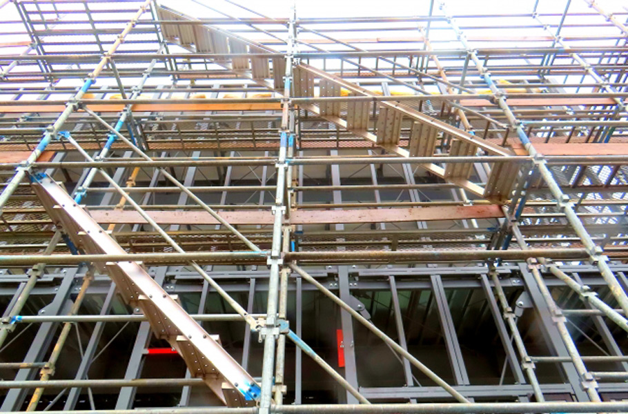 晃伸の鳶工事では、仮設足場の組立・解体、鉄骨建方、高所作業補助などを中心に、